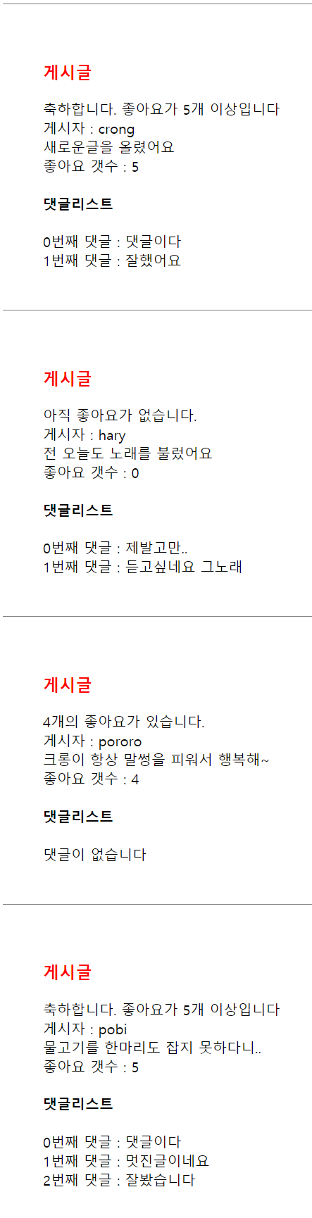 {"id" : 28, "name" : "hary", "content" : "전 오늘도 노래를 불렀어요", "like" : 0, "comment" : ["제발고만..","듣고싶네요 그노래"]},